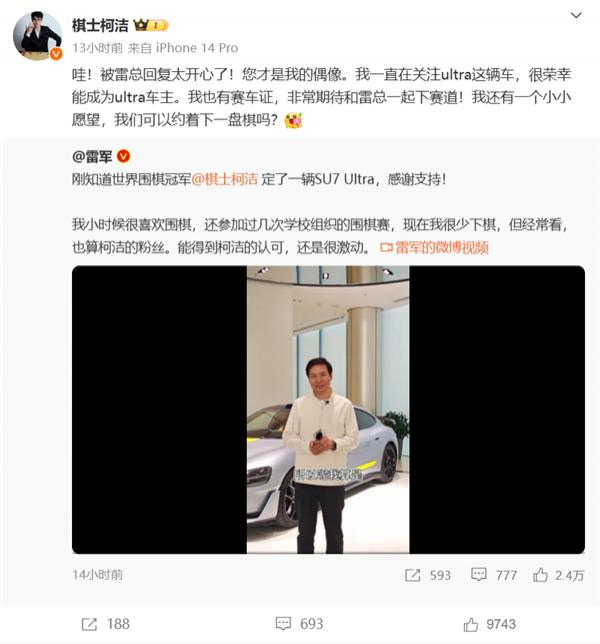 在被雷军回应之后,柯洁发了一条信息,说,雷总你是我的偶像,一直在关注。 Ultra 这辆车,自己也有跑车证,很期待和雷总一起下跑道,并邀请雷总一起下棋。
