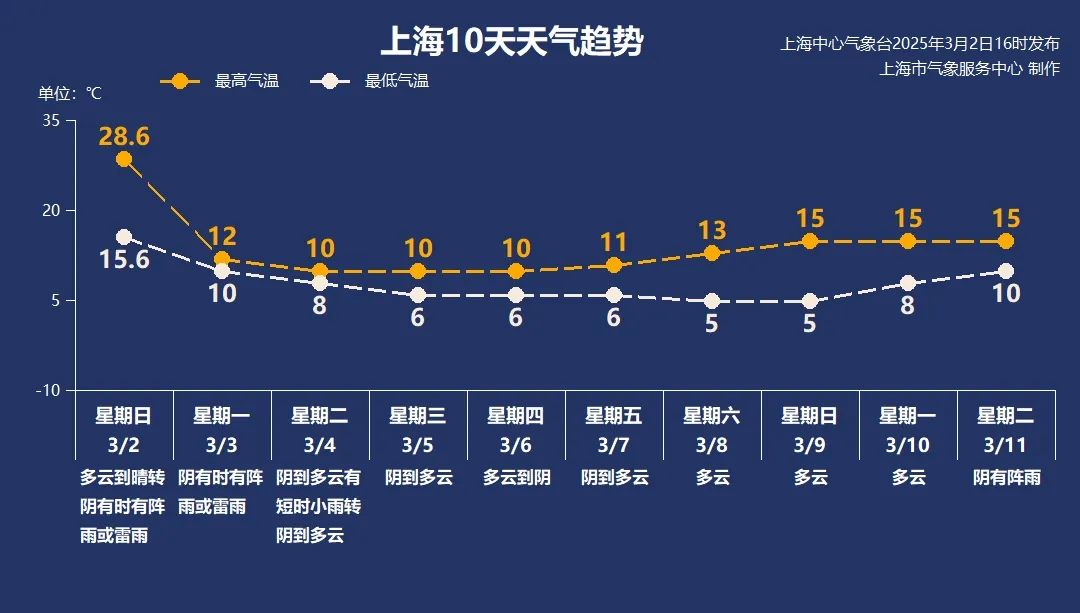 申城昨日白天气温迅速升高,最高气温一般升至28-30℃,其中青浦站29.9℃为全市最高气温,徐家汇站28.6℃,再次刷新了3月初同期的最高记录。
