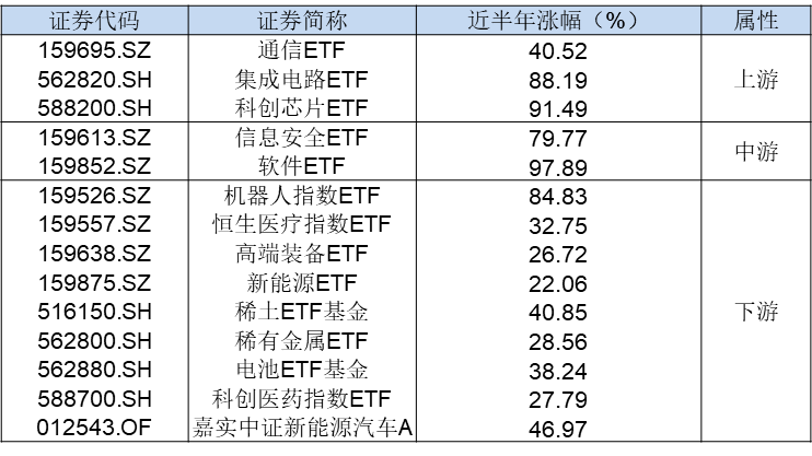 从上图看到,多只细分ETF表现出了强大的爆发力,比如软件ETF(159852)、科创芯片ETF(588200)、集成电路ETF(562820)、机器人指数ETF(159526)近半年来均超80%。