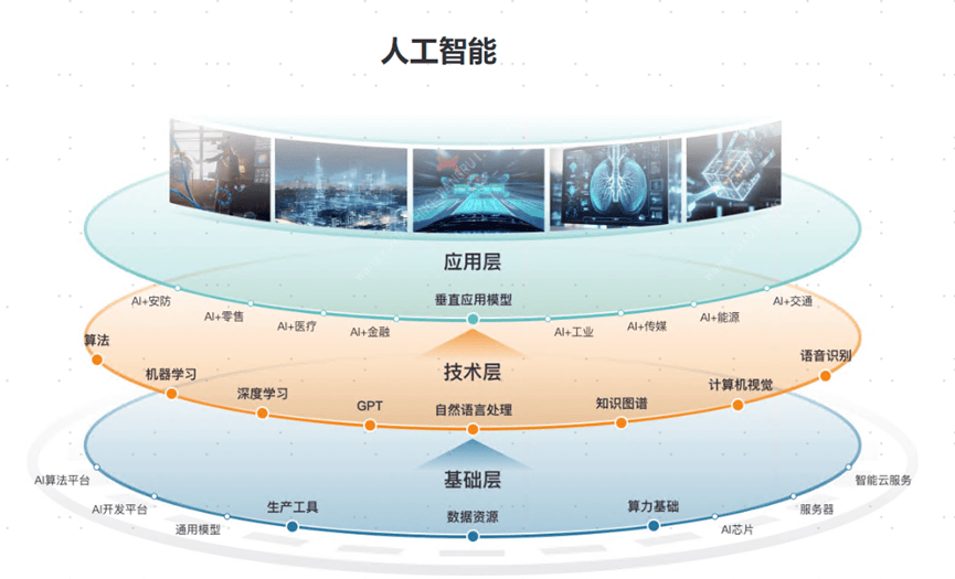 上游主要涵盖AI所需的基础硬件设施和基础设施支持,中游聚焦于AI技术整合和服务层,下游涉及终端应用和消费市场涉及多个行业领域。