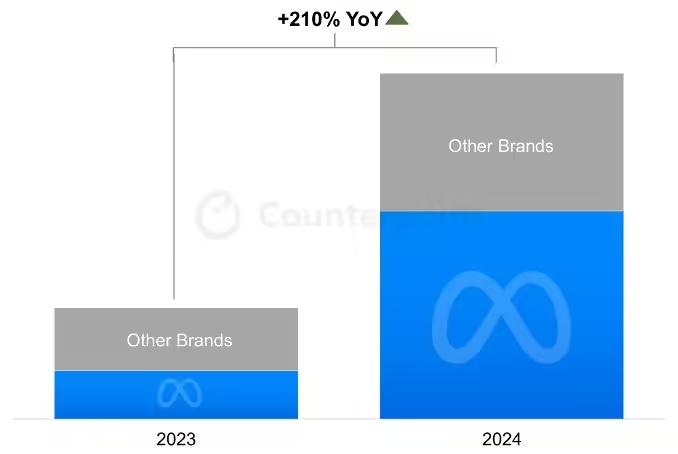 智能眼镜出货大增的背后,主要有Ray-Ban Meta的支持,数据显示,Ray-Ban Meta一款眼镜就独占了2024年全球智能眼镜出货量的60%。