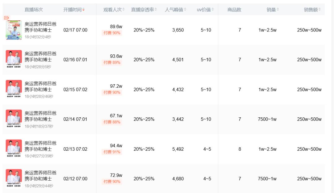 蝉妈妈数据显示,@奥运营养师吕爸【儿童成长】直播间的平均付费流量占比超过80%,有时甚至达到95%。对于这样严重依赖投流的账号,单爆品循环显然是最优选择。