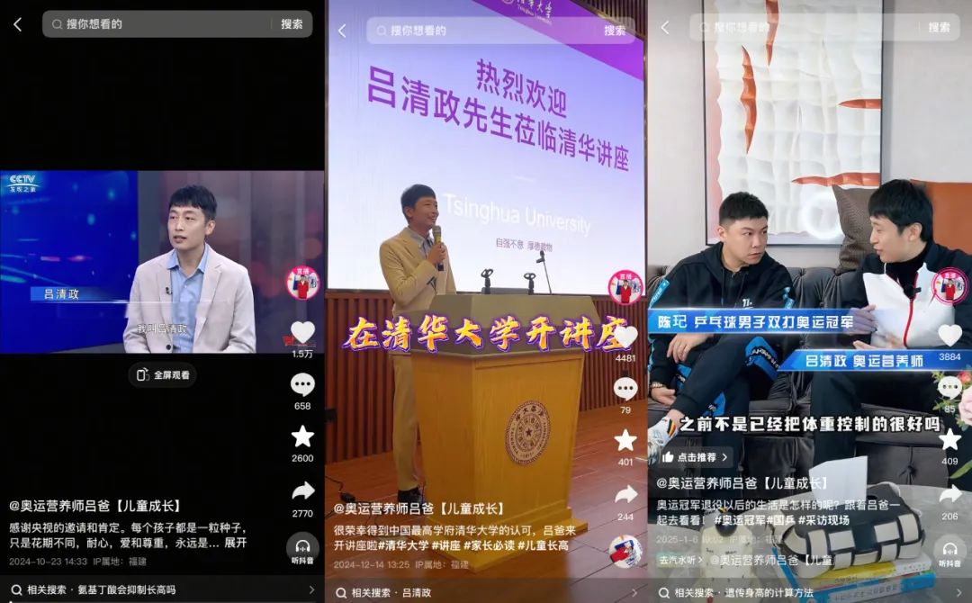 在冷启动期间,账号发布了各类科普视频,塑造IP的真实性;起号2个月后,账号发布了更多凸显人设专业度的视频,比如吕清政出席CCTV采访、参加行业大会、清华大学演讲的经历。