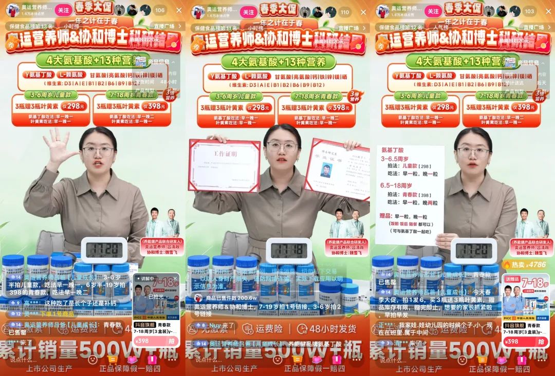 在强调产品的独特卖点之后,主播会强调成分优势、供应链优势和高销量纪录,以催动用户下单。“4大氨基酸+13种营养,γ-氨基丁酸、L-赖氨酸、甘氨酸、亮氨酸,都是足量添加,给孩子补营养。” “营养品头部上市工厂生产,单链接100万的销量,你吃3个月没价值,你会花第二次钱吗?”