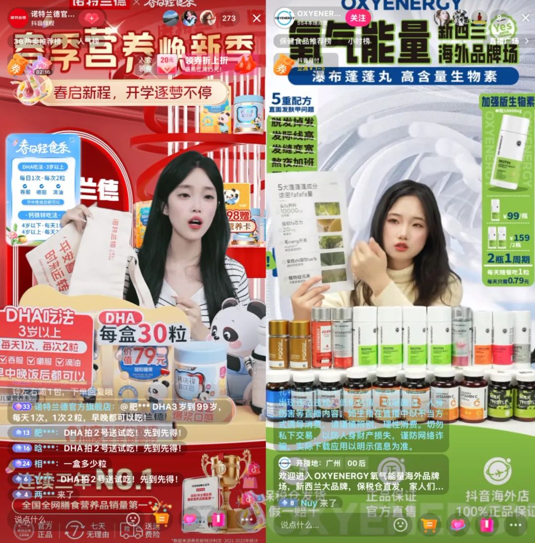 值得注意的是,保健品赛道冠军诺特兰德已经霸榜抖音三年,2022年品牌营收总额就已突破40亿,2024年其抖音旗舰店最畅销的单品“左旋肉碱10000饮料”已售出75万-100万件,销量第二的“b族维生素咀嚼片”卖出了100万+。OXYENERGY氧气能量是源自新西兰的膳食营养保健品品牌,于2020年进入中国,与诺特兰德同属济南斯伯特生物科技有限公司,目前在抖音主推护发、护肝产品,奶蓟草胶囊已售出273万瓶。