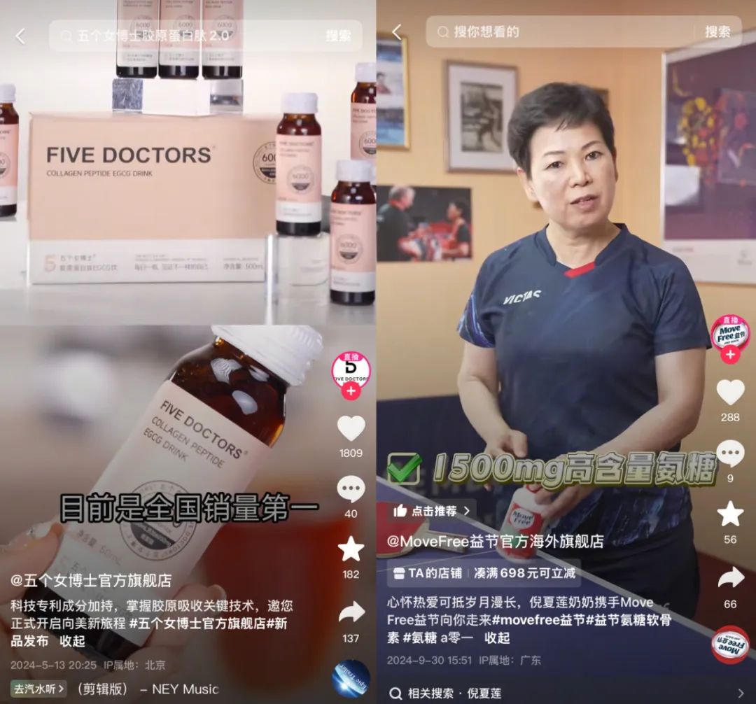 比如,五个女博士聚焦女性抗衰赛道,主打“北大医学博士”团队背书,主推成分是“胶原蛋白肽”;MOVEFREE益节则紧抓氨糖类目,围绕关节老化、术后修复、户外运动、节日送礼这四大场景创作内容,吸引都市银发、资深中产、小镇中老年等目标人群。