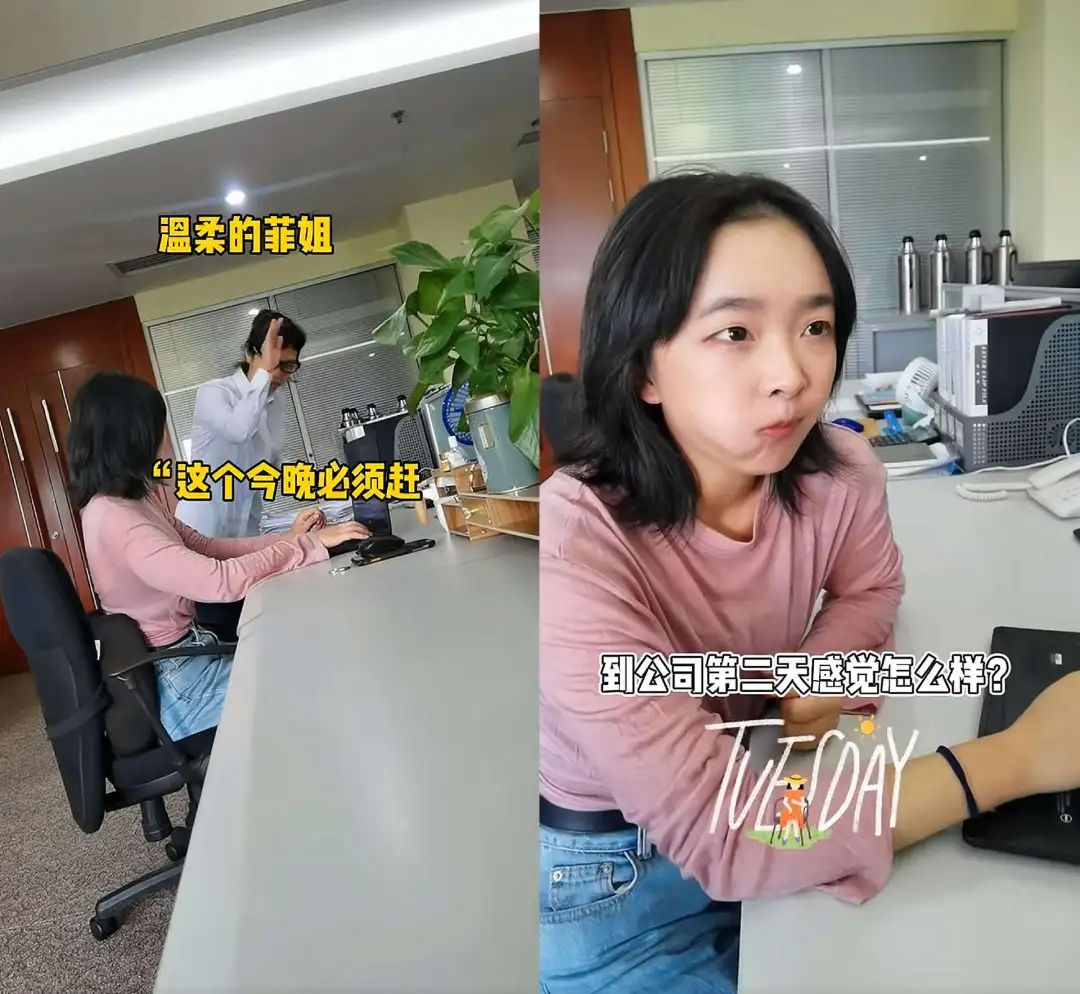 但在2020年,因为觉得抖音非常有意思,小颖的同事杨昕在公司内部发起了一个兴趣小组,希望利用业余时间拍一些剧情段子。因为大多是丽水本地的年轻人,精力足,拍摄也方便,很快,由小颖出镜、杨昕编导的“圆脸颖入职记”就上传了第一条视频。