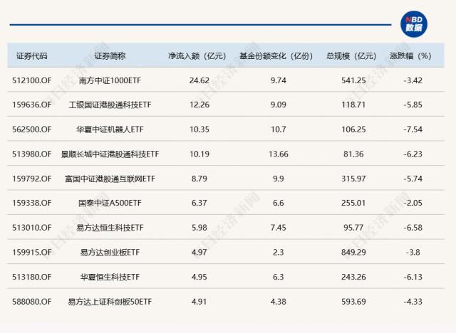 Wind 数据显示,是的 2 月 28 日的非货币 ETF 南方中证在市场上 1000ETF 增加了基金认购 9.74 十十亿份,净流入额为 24.62 1亿元;工银国证港股通科技 ETF 增加了基金认购 9.09 十十亿份,净流入额为 12.26 亿元;华夏中证机器人 ETF 增加了基金认购 10.7 亿份,净流入额为 10.35 亿元。