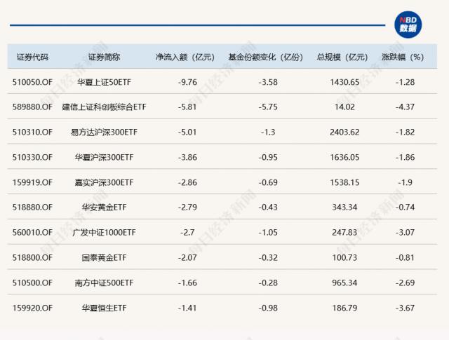 同时,华夏上证 50ETF 减少基金认购 3.58 一一一亿份,净流出额为 9.76 1亿元;建信上证科技创新板综合 ETF 减少基金认购 5.75 一一一亿份,净流出额为 5.81 亿元;沪深易方达 300ETF 减少基金认购 1.3 一一一亿份,净流出额为 5.01 亿元。
