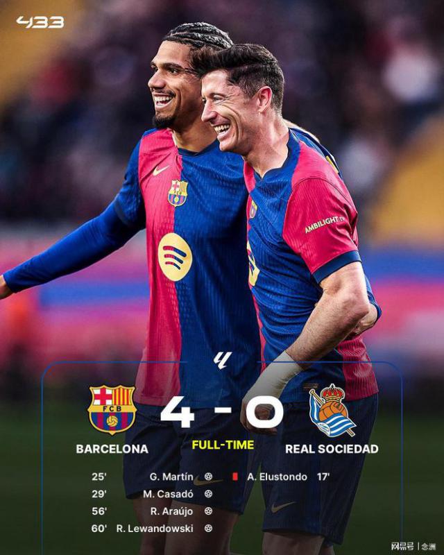 西甲第 26 巴萨主场的轮子 4-0 击败皇家社会,豪夺 6 连胜,再次登顶,1 优势领先。埃鲁斯通染红了很多,马丁进入了他的一线队,卡萨多扩大了他的领先地位,阿劳霍和莱万多夫斯基。 4 每分钟进两个球。