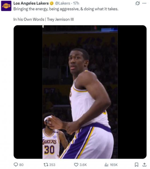 而且湖人队正式出现 3 月 2 日点赞了 2.06 米杰米森:带来能量,积极进取,做一切该做的事。用他自己的话来说——特雷 - 杰米森三世。在最近的三场比赛中,他获得了一些出场时间,在对阵快船的第一场比赛中,他打了一场比赛。 22 多少分钟,决胜时刻都打了一些。