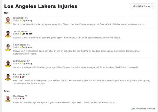 只有克勒贝尔和八村垒决定在湖人的伤病名单上缺少快船。詹姆斯、里夫斯、古德温和东契奇每天都有很大的概率观察比赛。换句话说,莱恩不在伤病名单上。