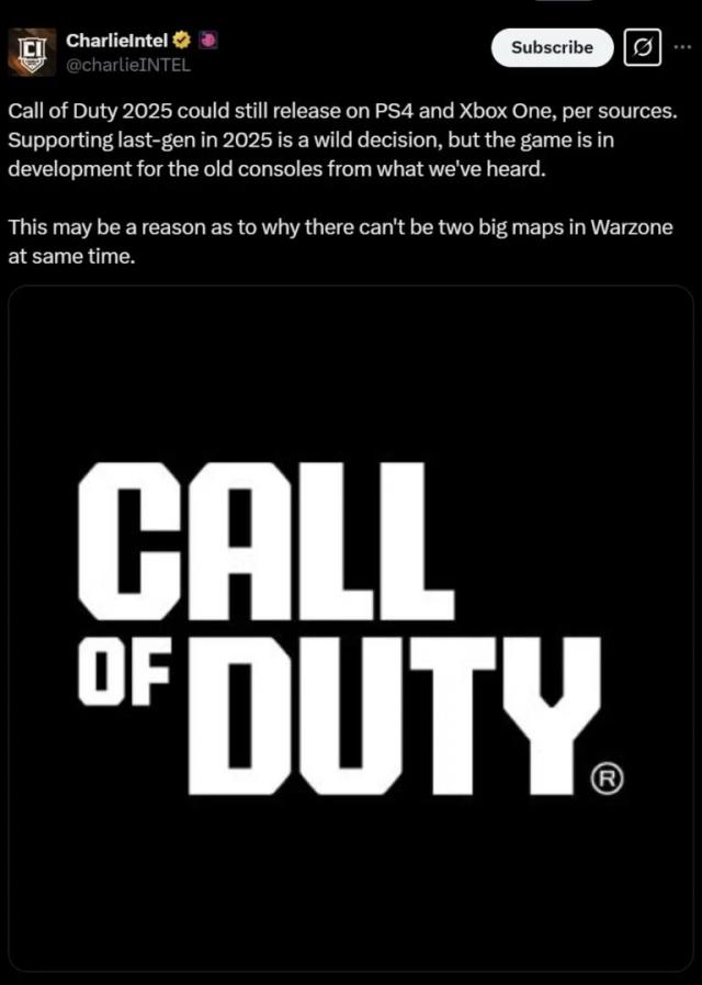 据报道,这些旧主机版正在开发中,并计划与今年冬天相结合。 PS5 和 Xbox Series 同步发布版本。博主们长期关注《使命召唤》系列 CharlieIntel 意思是“使命召唤” 仍然有可能推出2025 PS4 和 Xbox One 版本。2025 每年仍然支持上一代主机决定颇为大胆,但是,据我们所知,这个游戏确实是为旧主机开发的。