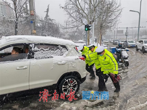 济南交警特别提醒:请高度重视天气变化,注意出行安全,尽量避免绕道容易积雪结冰的道路,共同营造安全畅通的道路交通环境。(济南日报·爱济南 记者:杨晨)