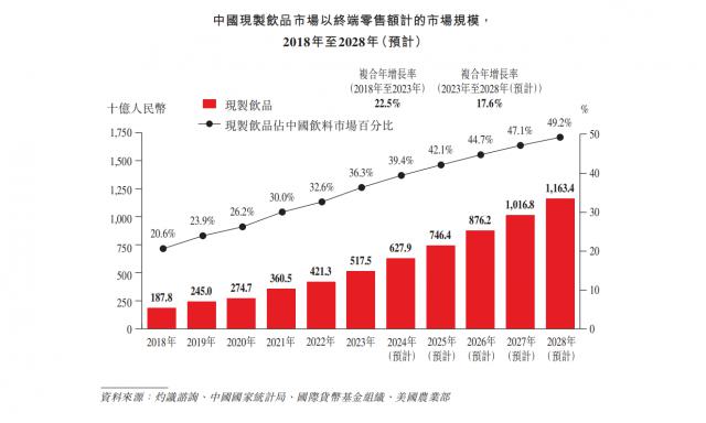 数据也显示,到 2028 2008年,以终端零售额计算的中国现制饮料市场市场规模估计达到 11634 亿元,将成为与预包装饮料并列的万亿级市场。