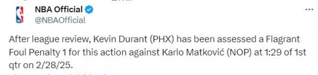 北京时间 3 月 3 日,NBA 正式发表声明,经联盟审查, 3 月 1 日(北京时间)太阳对鹈鹕的比赛第一节还剩下。 1 分 29 几秒钟后,杜兰特对马特科维奇的这种行为升级为一级恶意犯规。