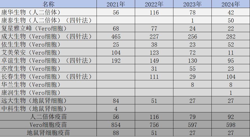 随之而来的是,人双体狂犬病疫苗的批发数量大幅增加,从2021年的56批增加到2024年的92批,布局企业数量也从过去的康华生物扩大到康华生物和康泰生物。人双体狂犬病疫苗也成为狂犬病疫苗流行中唯一的增量。