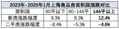 根据2023年至2025年1月的官方统计数据,房价涨跌与面积段密切相关。