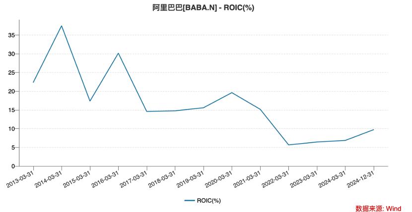 据WIND统计,阿里ROIC在2025财年前三个季度(2024自然年Q2-Q4)跃升至9.75%,全财年回归双位数应该没有太大悬念。