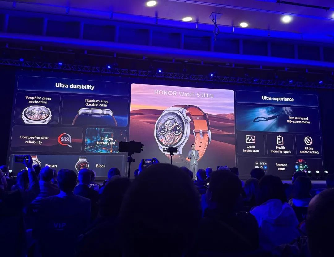 高档智能手表「Watch荣耀 5 Ultra」:选择钛合金Grade 5表壳、蓝宝石表镜、陶瓷后盖,重量轻,超耐用,续航时间近15天,电池480mAh,防水性能支持深潜40米,提供端侧AI分析等高精度健康数据收集功能,可进行智能推荐。