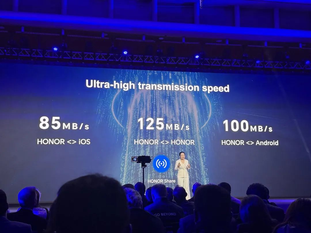 荣耀在生态互联方面的推出全球首个全生态文件共享技术,可以进入多个iOS、高速传输文件的安卓设备,荣耀设备的互传速度高达125MB/s,荣耀与其它安卓设备的互传速度达到100MB/s,荣耀与iOS设备的互传速度达到85MB/s。