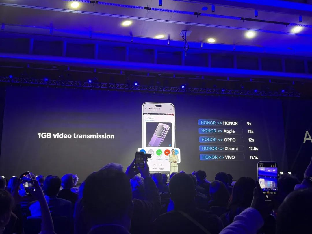 荣耀晒出传送1GB视频时与不同设备的传送时间:荣耀设备之间的传送时间仅为9秒,荣耀与苹果,OPPO、大约11秒~13秒,小米,vivo互传。