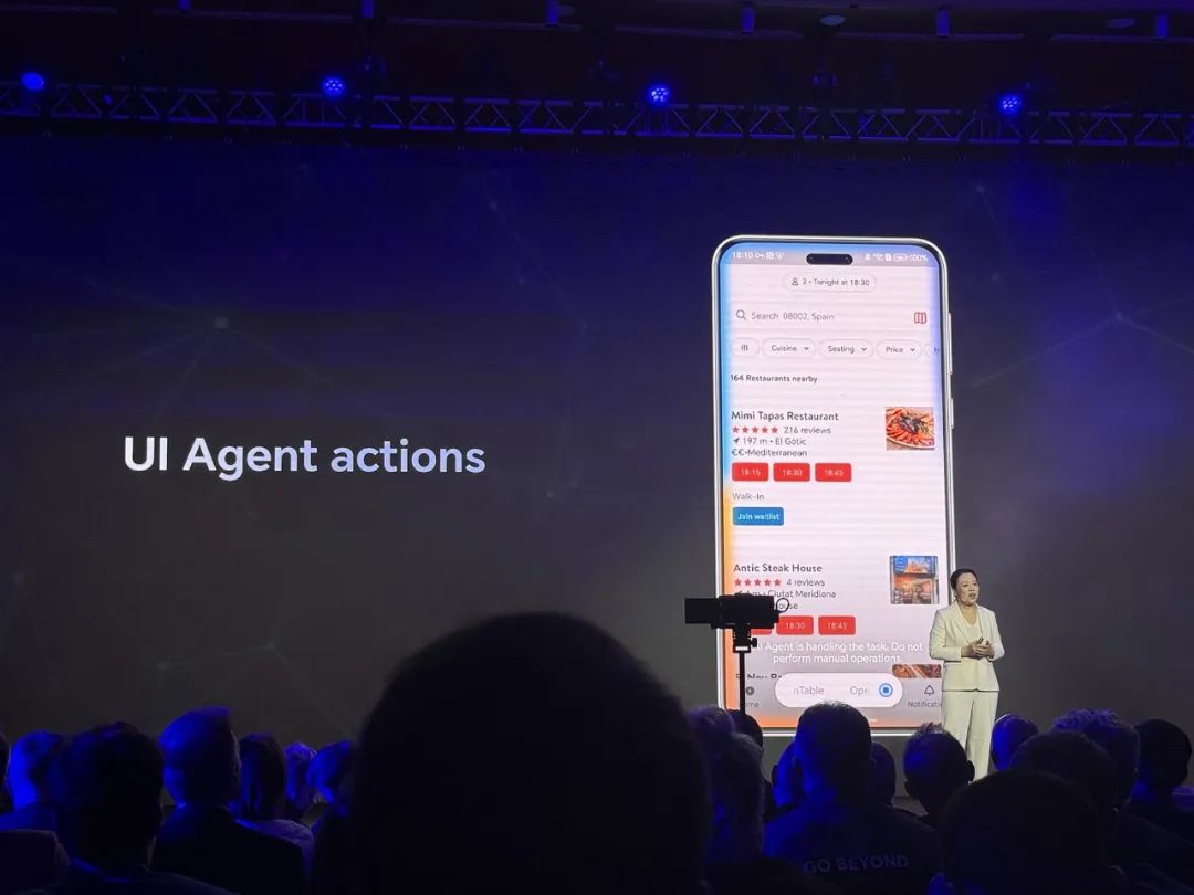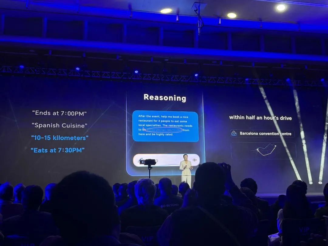 在与谷歌云、高通技术公司的合作技术展示中,当客户要求“活动结束后,预订一家餐厅,供4人食用当地特色菜,半小时内旅行,评价高”,荣耀AI。 agent会理解意图,抓住“活动之后”、“地方特色菜”、根据日程记录、位置、实时交通状况等关键信息,“路程半小时内”,推理是在一家10-15公里的餐厅预订19:30就餐,需要开半个小时左右,还有西班牙菜。