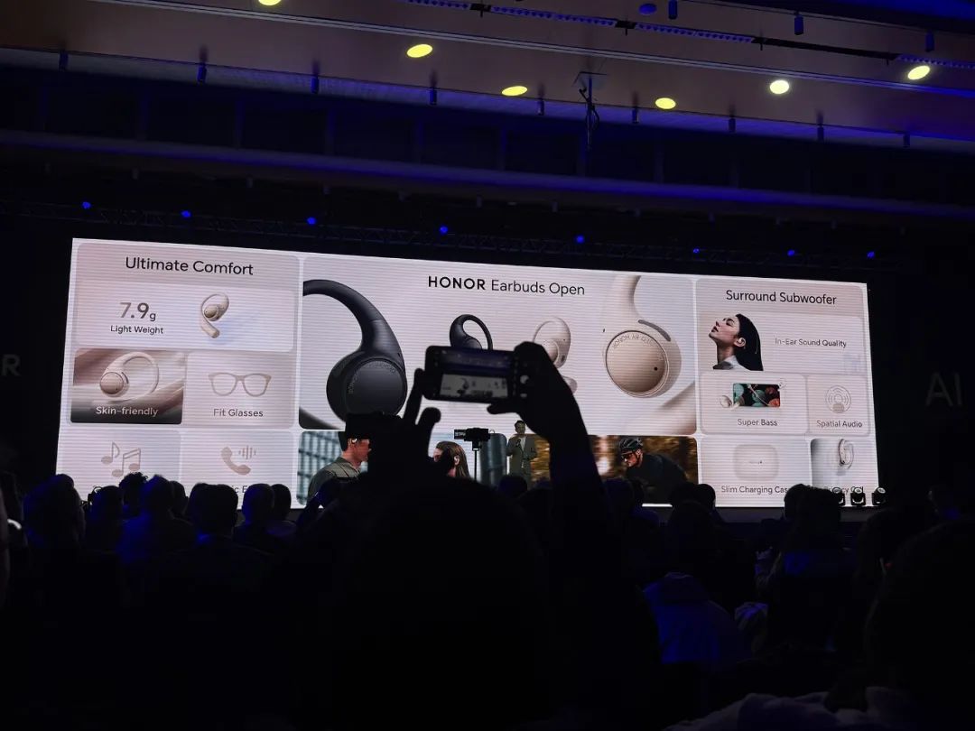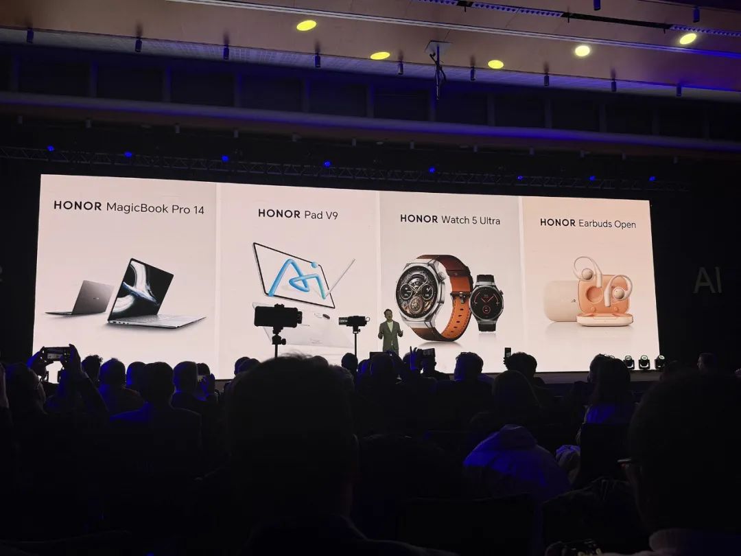 AI MagicBokPC荣耀 Pro 14、PadPad平板电脑荣耀 V9、Watch智能手表荣耀 5 Ultra、EarbudsAI耳机荣耀 Open,将AI融入到产品体验中。
