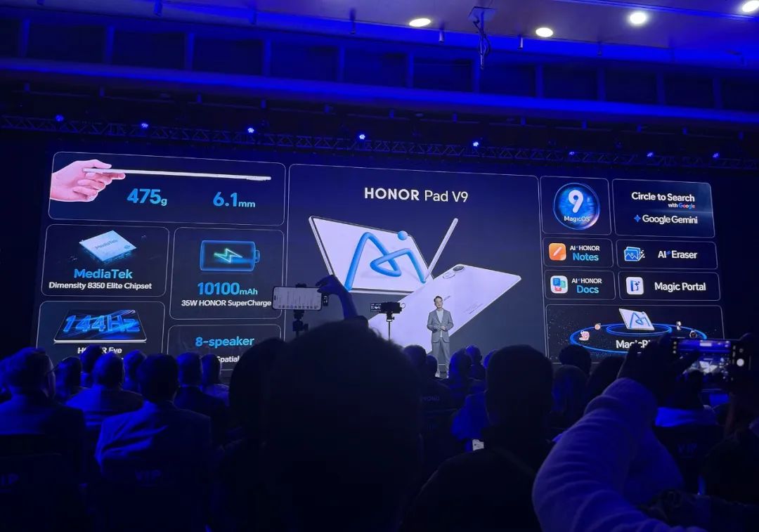 AI平板电脑「荣耀Pad V9」:机身薄至6.1mm,配备MTK天玑8350克,重475克。 10100mAh电池Elite芯片组 35瓦快充,2.8K分辨率,144Hz刷新率,10Bit色深,IMAX增强,TVÜ Rheinland认证护眼屏,提供AI笔记、AI文档、AI清除、画圈搜索、荣耀任意门等AI功能。