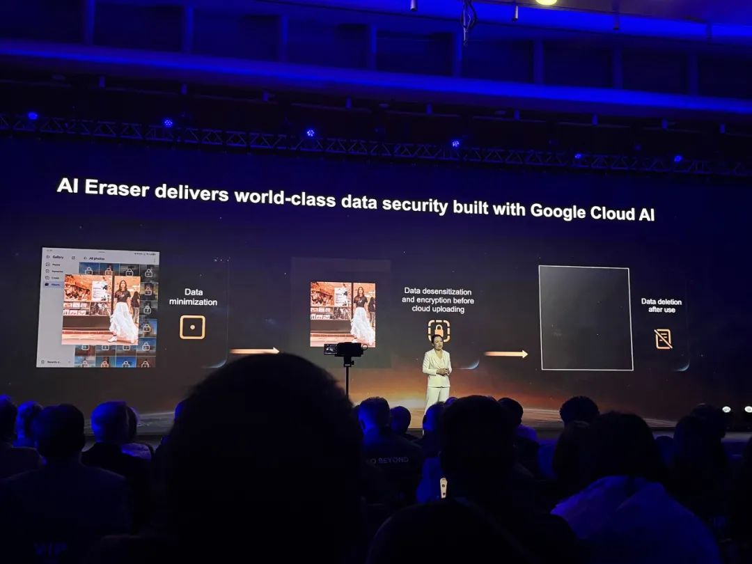 对于数据安全,荣耀推出了AI清除功能,在上传到云端之前,先对照片上的数据进行脱敏和加密,使用后再删除数据。
