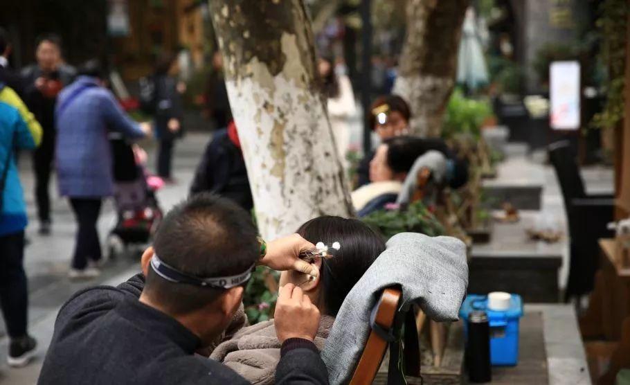 成都宽窄巷东广场,几十把竹椅排成一排,来自全国各地的游客坐在竹椅上休息,旁边的师傅们都很忙。他们把细长的镊子、耳勺和鹅毛棒伸进顾客的耳朵里,而顾客则微微闭上眼睛,看起来很悠闲。