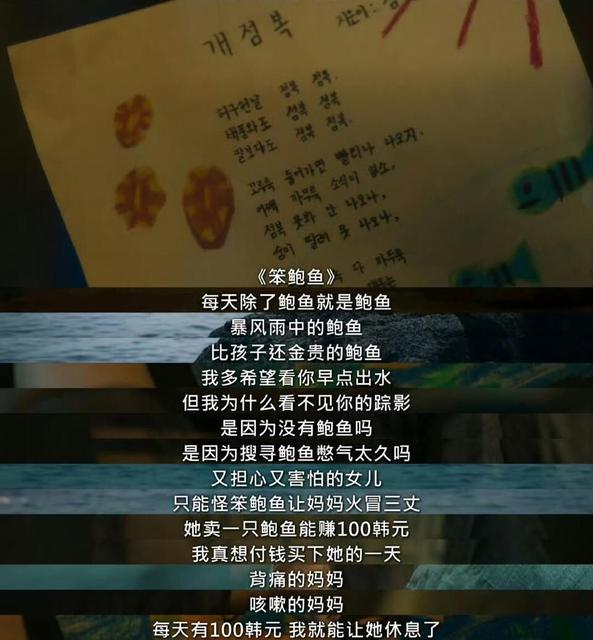 小时候的爱纯看见当海女的母亲,会为她担心甚至生气,而她写的那首诗,又让母亲忍不住哭了。
