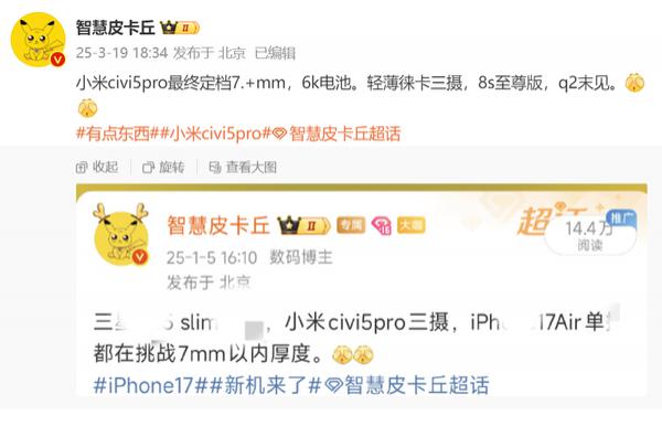 曝光小米Civi 5 第二季度末发布了Pro 薄厚7开头 内置6K电池