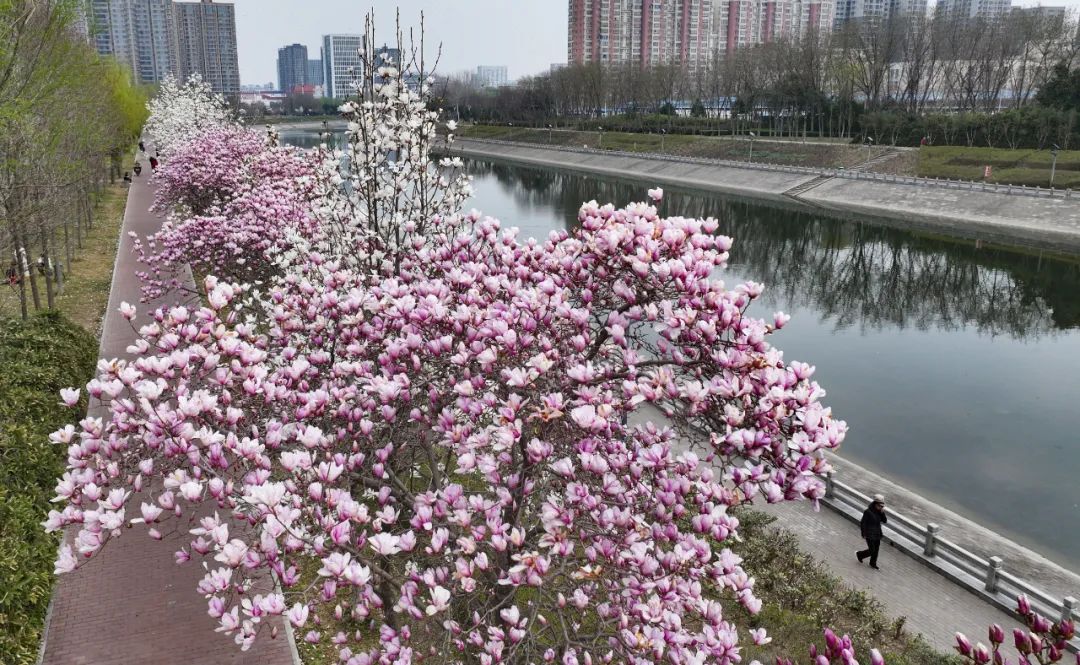 三月十八日,一排美丽的玉兰树在永平路北侧的七里河西岸绽放。马健路 拍摄