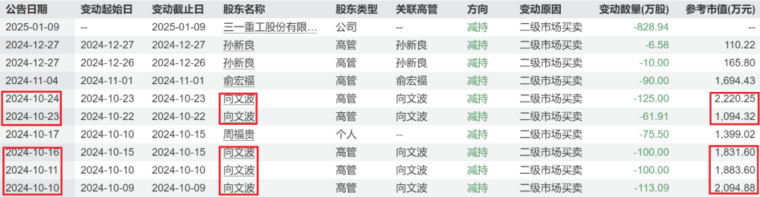 根据公告披露,2024年10月9日至2024年10月23日,向文波通过集中竞价减持了500万股三一重工股份;根据当时相关交易的平均价格,套现金额约为9123万元。现在,向文波还拥有2719万股三一重工股份。