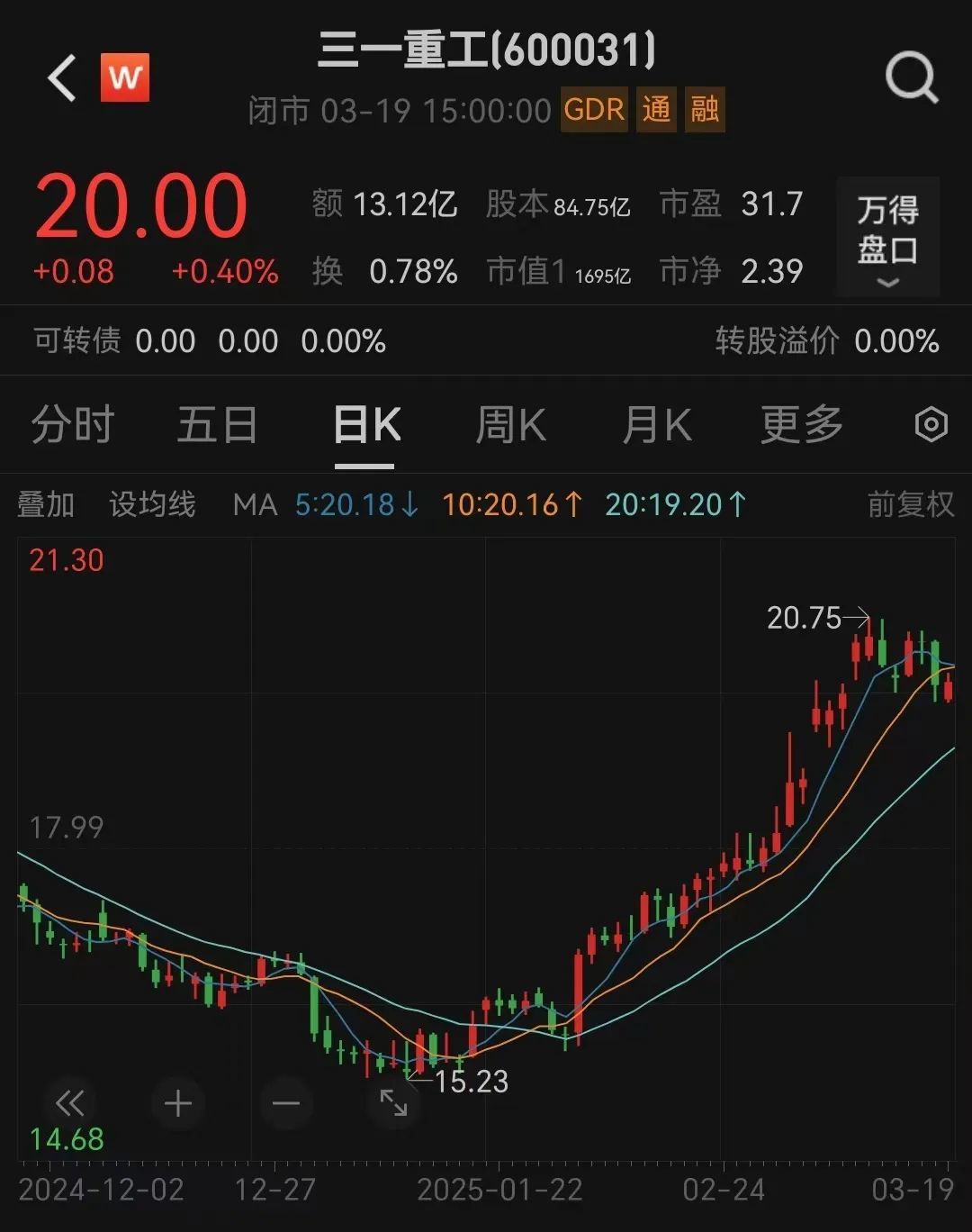 三月十九日,三一重工股价以每股20元收盘,最新市值为1695亿元。