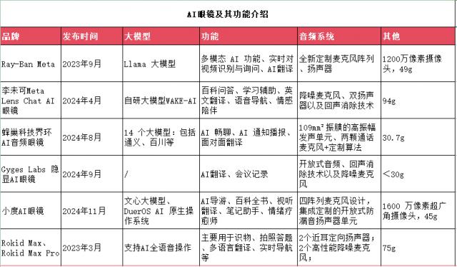 比如 Ray-Ban Meta 新型号搭载的是 Meta Llama3 大型模型,李未可 Meta Lens Chat AI 眼镜配有自研大模型。 WAKE-AI 大模型等。与此同时,我们还可以看到一款智能眼镜会搭载多个。 AI 大型模型,例如 Rokid Glasses 配备通义千问,DeepSeek、多个大模型,如豆包、智谱清言、纳米搜索等,蜂窝科技界环环 AI 音频眼镜配有通义、百川等内容。 14 个大模型。