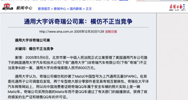 但奇瑞一句 " 我们没有抄袭,这叫工程模仿。 " ,加上商务部的一句话 " 通用专利没有在中国申请外观专利。 ",只是把诉讼扛过去了。