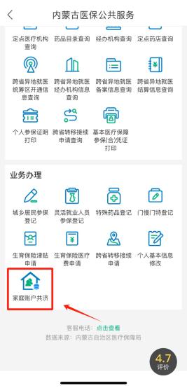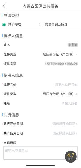 进入“医疗保险区”后,找到“家庭账户共济”服务,选择“共济授权”申请类型,填写用户信息和开始日期。
