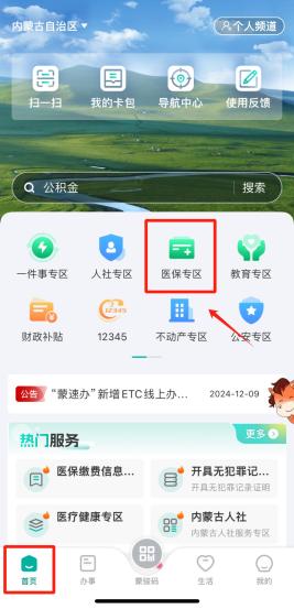 打开并登录“蒙速办”手机端(App、小程序和支付宝小程序),在【主页】中找到“医疗保险区”,点击查看。