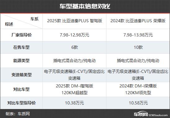 2025 款比亚迪秦 PLUS 共推出了智驾版 6 款车,相比 2024 款比亚迪秦 PLUS 荣耀版少了 4 款车。在售价方面,新款车型的起售价格与老款车型保持一致,均为 7.98 一万元,顶配车型的价格降低了。 1 万元,顾客买车成本较低。这次比较选择了主销。 DM-i 车型,而且两款车型的价格也非常接近,这样才能更直观地看到新旧车型在配置上的具体差异。
