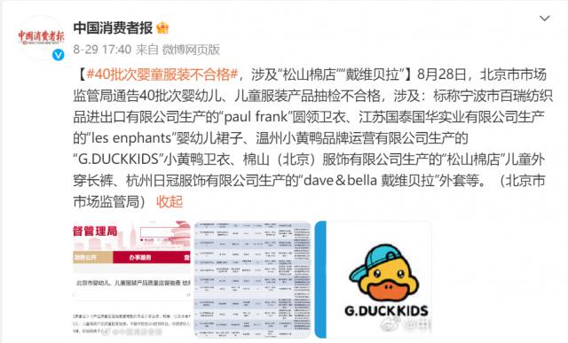 此前,北京市场监督管理局组织对婴幼儿、儿童服装产品和童鞋产品质量进行了首次检查,结果显示, 150 批量样品,检测出来40 批量样品质量不符合相关标准。