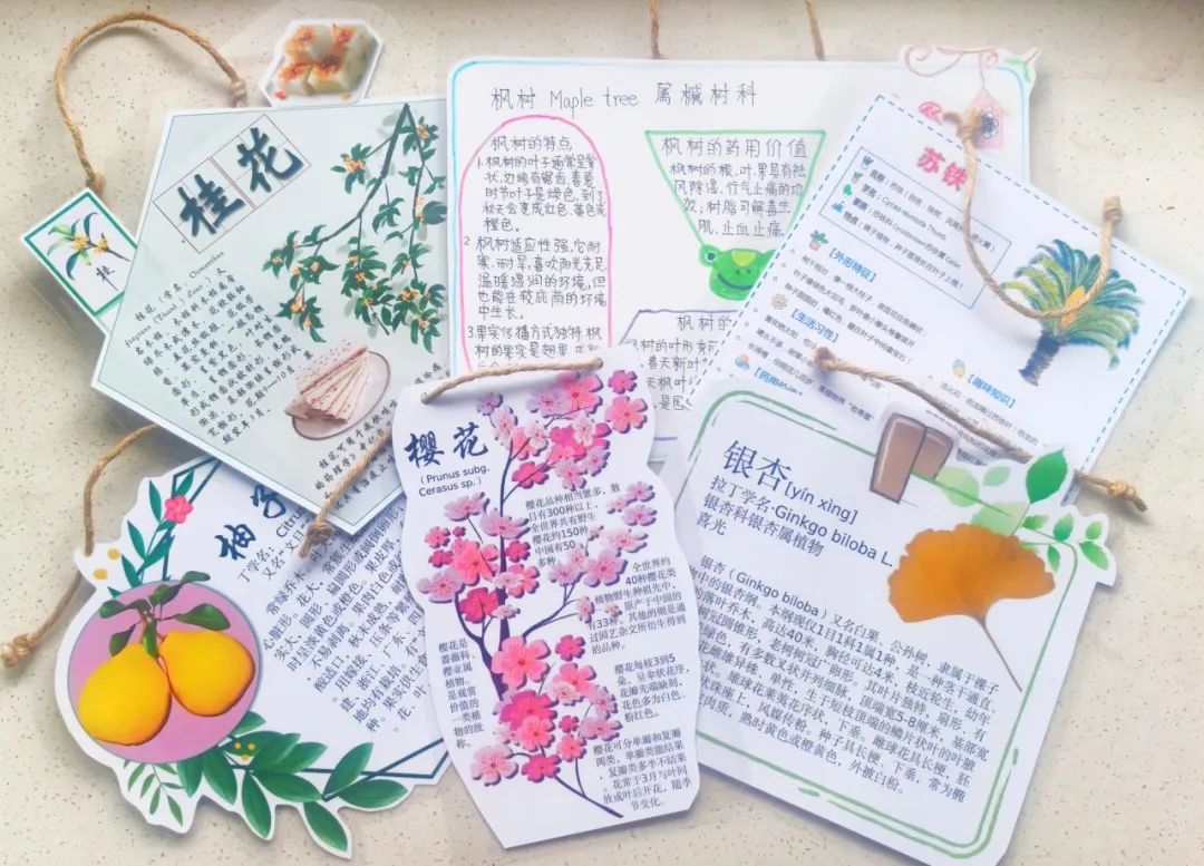 活动发布后,“社区小先生”们迅速得到热烈响应。在短短两个星期内,居委会收到了数十个制作精美、创意独特的植物铭牌。这类铭牌内容丰富,包括树名、科属等基本信息,更融入了小先生们的奇思妙想和对自然的热爱。它们用五颜六色的画笔在铭牌上精心绘制图案,详细标注植物名称、习惯、特征等内容。有的铭牌以卡通形象呈现,活泼灵动;有的引用经典诗词,充满文化魅力;其他人使用环保材料,充分展示了小先生的环保理念。