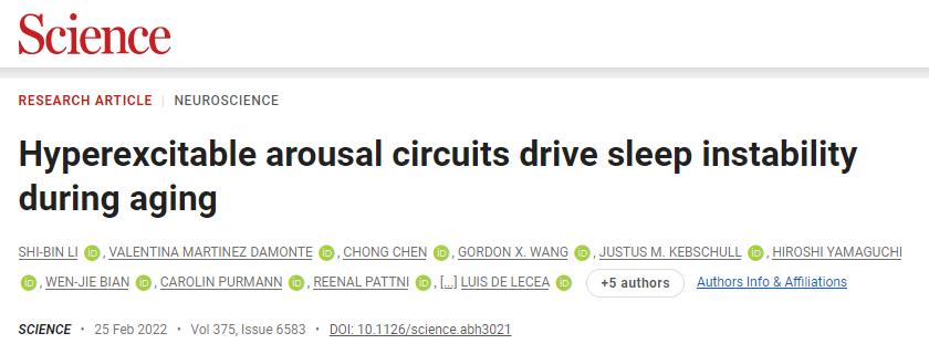④Li SB, Damonte VM, Chen C, Wang GX, Kebschull JM, Yamaguchi H, Bian WJ, Purmann C, Pattni R, Urban AE, Mourrain P, Kauer JA, Scherrer G, de Lecea L. Hyperexcitable arousal circuits drive sleep instability during aging. Science. 2022 Feb 25;375(6583):eabh3021.