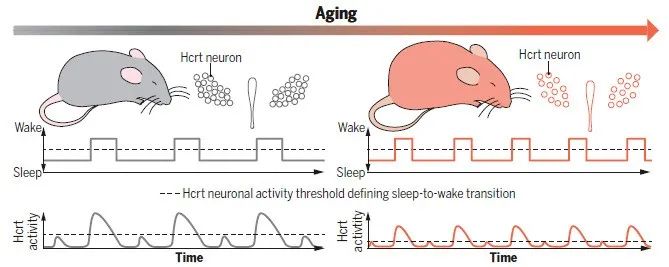 Hcrt神经元可以说是控制清醒和睡眠状态的“开关”,但随着年龄的增长,它变得越来越“敏感”,甚至有些“失控”。通过不同年龄的老鼠实验,发现老鼠的Hcrt神经元容易激活,导致清醒和睡眠状态频繁变化,最终导致睡眠中断。