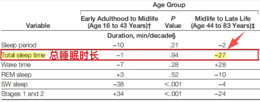 从40岁到50岁,这些变化会更加明显,同时整体睡眠时间也会减少。这项研究表明,从中年(36-50岁)到晚年(71-83岁),平均每10年总睡眠时间减少27分钟。这种变化主要发生在50岁以后。也就是说,50岁以后,每10年的总睡眠时间减少27分钟。②
