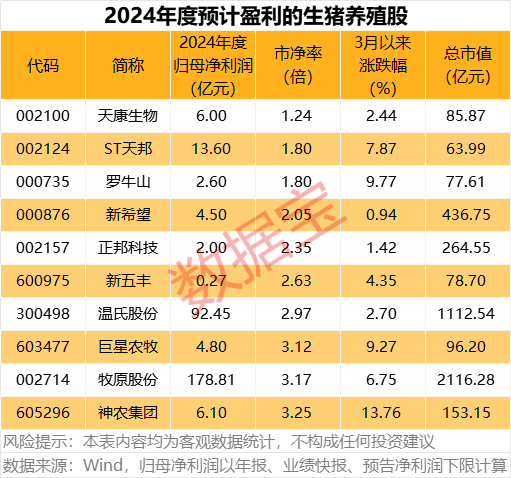 牧原、温氏、ST天邦、神农集团、天康生物预告归母净利润超过6亿元,预计扭亏增盈的上市公司中,天康生物估值较低,最新市净率仅为1.24倍。
