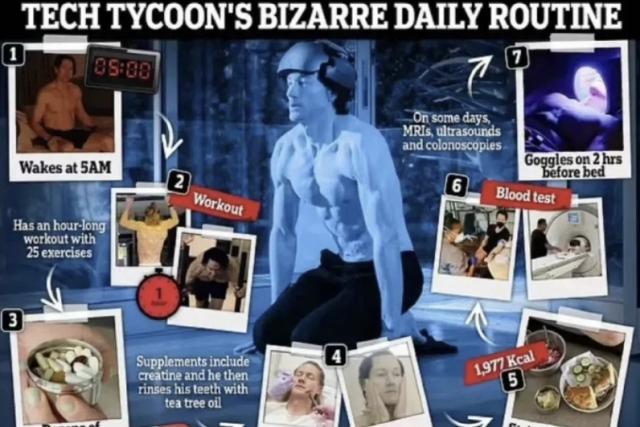 " ChatGPT 鼻祖" Sam Altman,每日磕糖尿病药物抗衰老,还要每天睡在“寒冷、黑暗、安静的房间”;谷歌技术主管 Ray Kurzweil 不只是每天花费 2 万美金服用 250 颗粒颗粒;镜像人工智能公司 Mirror AI 创始人塞吉 · 法盖特,为了“长生不老”,我把自己变成了一个行走的药罐,每天都会吞下一堆药丸,包括很多违禁药物,还可以给自己注入一种生成人类生长激素;科技富豪 Bryan Johnson 为“回归” 18 岁,每年花 200 一万美元保养身体,包括一系列检查,如不限于5:00起床锻炼、全素饮食控制热量、全方位监测70多个器官——通过血液测试、磁共振、超声波、结肠镜等。,不断监测生命体征和生化指标,甚至连睡觉都要连接机器监测下半身。 ... …
