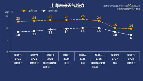 三月二十一日(星期五):晴朗到多云,9~23℃
