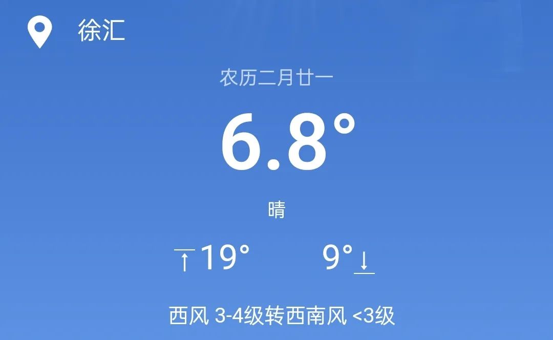 今日(三月二十日)天气晴朗至多云,气温持续上升。徐家汇站在早晨气温起步的6℃周围,郊区一般为1~6℃。白日南风缓缓,南至西南风3~4级,临江沿海城市4~5级,气温也随之上升,预计最高气温可上升至20℃。早晨出门还有生寒,中午一派暖意融融,是典型的春天。最好是洗衣晒被,享受阳光。今日相对湿度为80%~25%,空气干燥时注意补充水分。